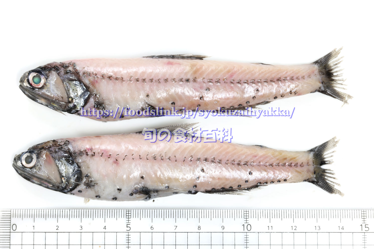 全身の鱗は漁獲時に全てはがれており、肌色でつるっとしている。体側の腹側に黒く丸い斑点が並ぶが、これが発光器である。また、頭部の眼前にもついている。これらの発光器の大きさや並び方は種によって少しずつ異なり、見分ける要素となる。