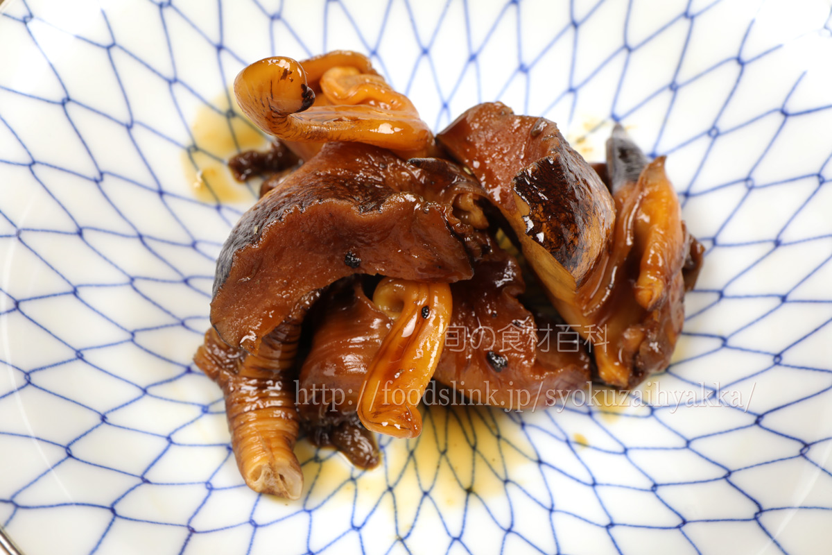 塩ゆでして取り出したスジウズラガイの身を食べやすい大きさに切り、酒、醤油、みりん、ザラメで佃煮にしたもの。適度な歯ごたえがあり普通に美味しい。