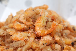スジエビを千切りにした人参や玉ねぎなどと共に衣をまぶして揚げたもの。