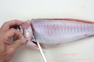 尾の付け根辺りから刃先をいれ刃先を前後に動かしながら進める。