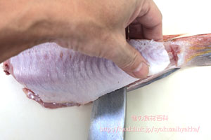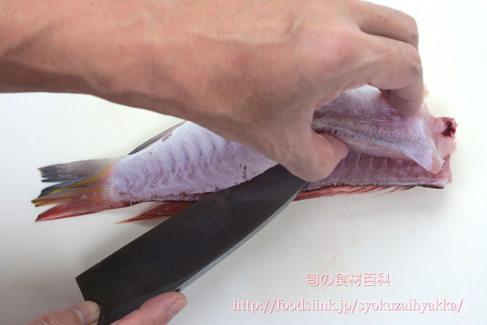 大きいアマダイを刺身用にする場合は、血合いの部分で背と腹の身に分けてさくにする。この時、血合い骨が腹身に残るように骨に沿って背の身を切り離す。