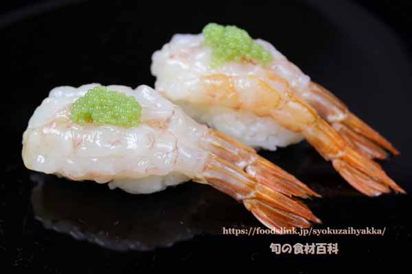 食感は甘海老(ホッコクアカエビ)よりもしっかりとしているが、クルマエビのようなシコシコ感は無い。旨みは甘海老より強い印象を受ける。ただ、殻は少し剥きにくい。