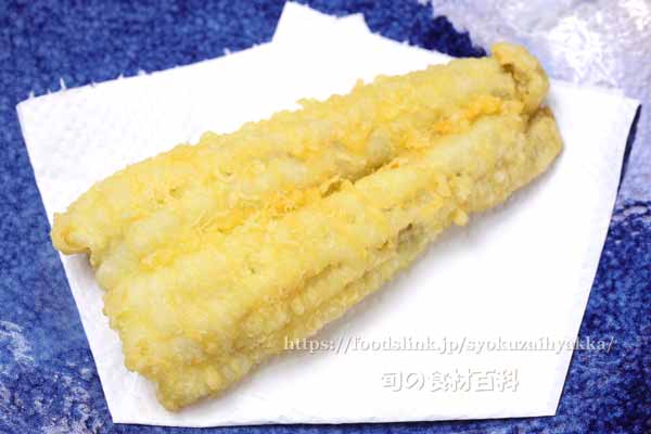 ハモを開いて骨切りしたものを天ぷらにしたもの。粉を打つ際に骨切りした切り目の隙間にもしっかりと粉が付くようにまぶして衣を着けて揚げます。