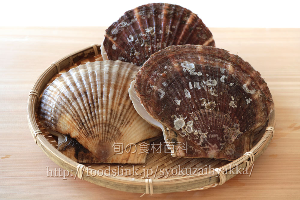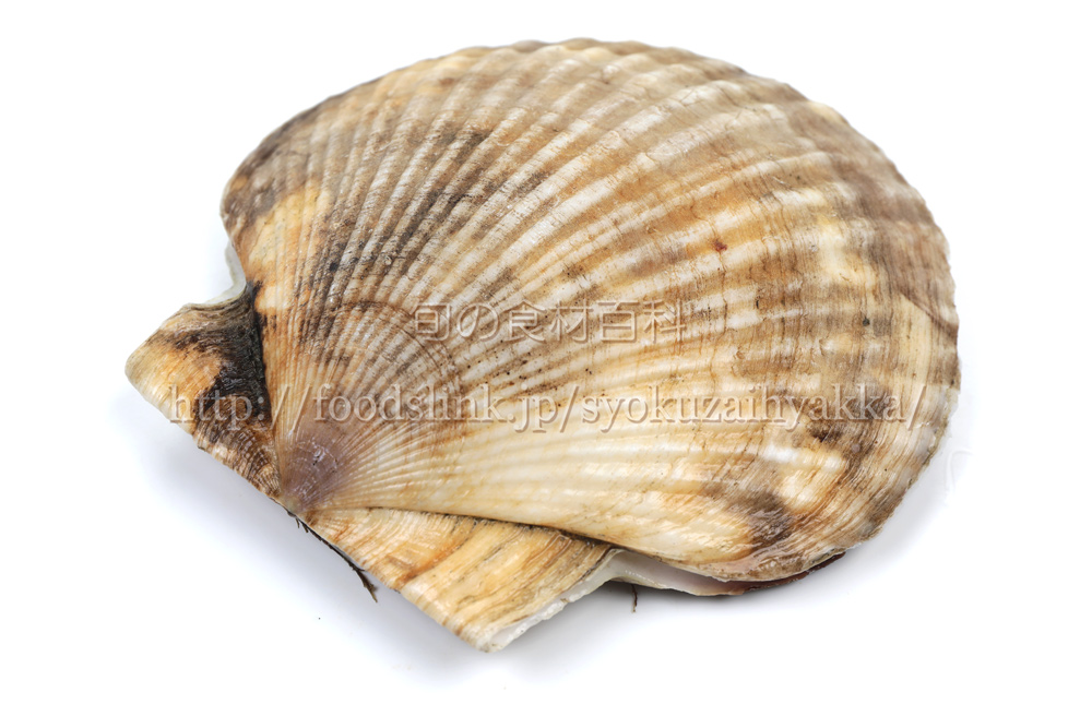 ホタテガイ/ほたて貝/帆立貝の様々な写真を紹介します。ホタテガイは殻長20cm前後の扇型の二枚貝で、左右で殻の色や形が違うのも特徴。少し丸く膨らんでいる方が右の殻で、そちらの殻は外側が白っぽく、もう片方は平らに近い形で外側は紫褐色。白い右の殻の方が若干大きい。殻の表面には放射肋(ほうしゃろく)と呼ばれる波状の起伏が蝶番の中央辺りから放射状に