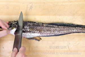尾の切断面から、背の平らな部分の皮と身の間に刃先を入れ、皮を削ぐように切り進める。