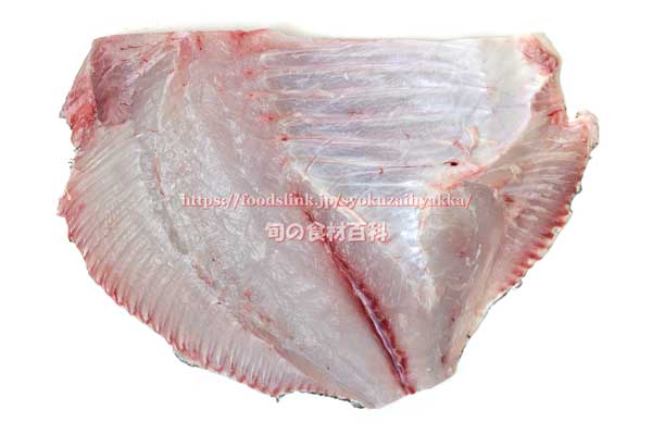 個体によって中骨のエンガワ近くに数か所、マダイによくみられる鳴門骨と呼ばれる瘤状になっていることがあり、その場合、三枚におろす際に刃先が進まずさばきにくいです。写真の中骨にも背側に3箇所、腹側に1箇所瘤がありました。