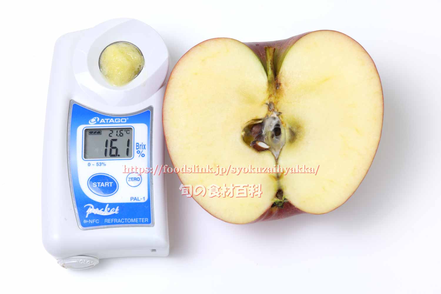 生のまま食べてみると食感は「紅玉」よりも硬いかもと思う感じです。果汁感は弱いですが甘味が思いのほか強く、活き活きとした酸味と相まって濃厚な甘酸っぱさとなって口に広がり、これはこれで美味しいリンゴだと思いました。計った糖度は16%ありました。