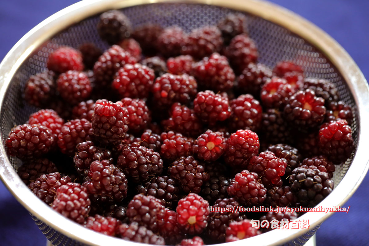 写真は自宅庭で収穫したものです。真っ黒に近くなるまで熟したものは適度な酸味と、十分な甘さがあり、口に入れた時の食感はラズベリーよりも柔らかく感じす。種はラズベリーよりも存在感がありますが、ブラックベリーほどは口に残らない感じです。写真ではまだ赤味が残っているものも摘んでいますが、こうした赤いものは未熟で甘味よりも酸味が強く感じられます。