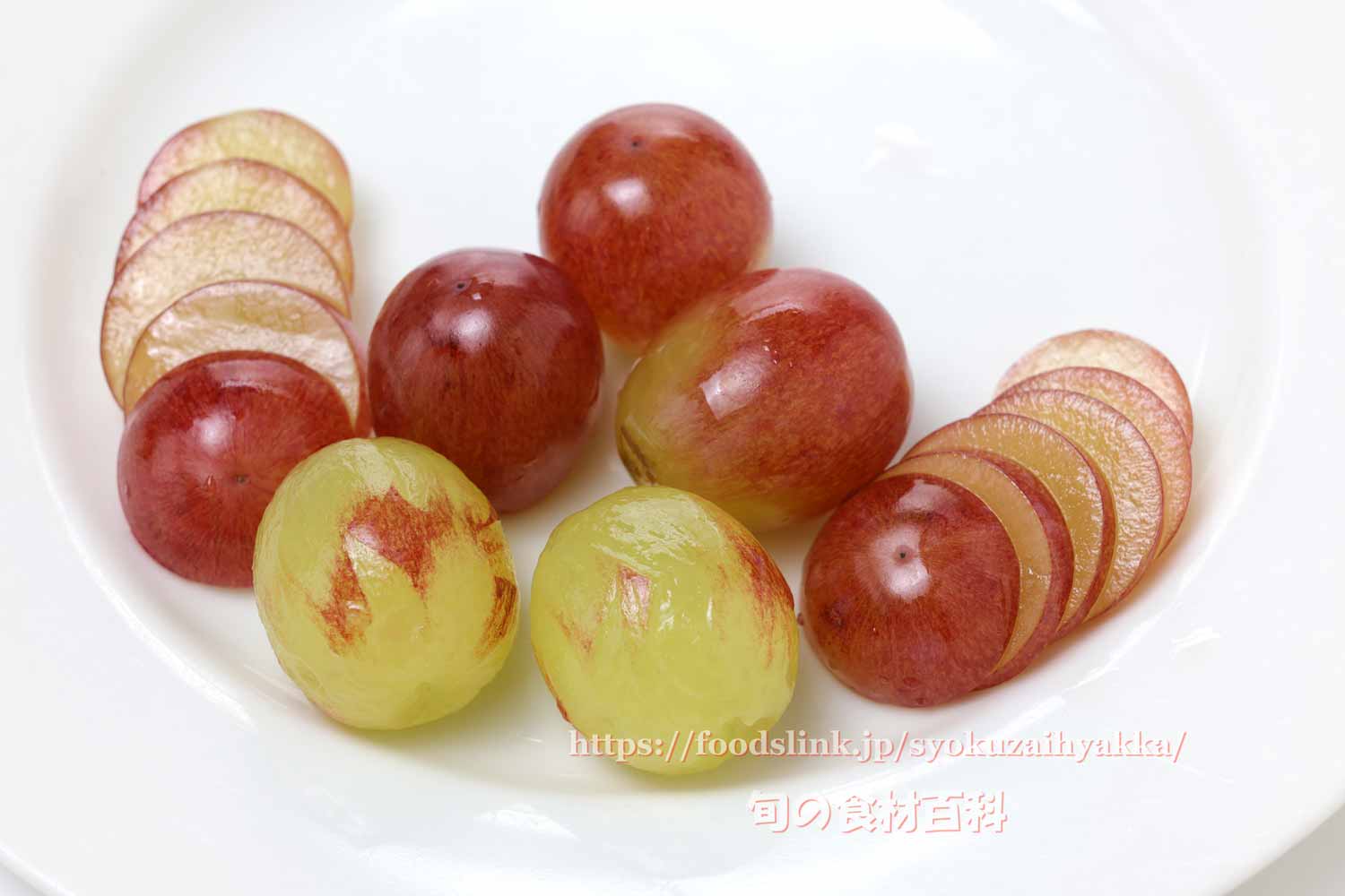 山梨県のオリジナルぶどう新品種、甲斐ベリー7/サンシャインレッドの画像一覧です。甲斐ベリー7/サンシャインレッドの特徴が分かりやすいよう果房や果粒とその断面、皮をむいた状態などいろいろな角度で撮影しています。撮影した甲斐ベリー7は果房重520gほどのもの2房で、よく着色している房と、着色が浅めのものです。