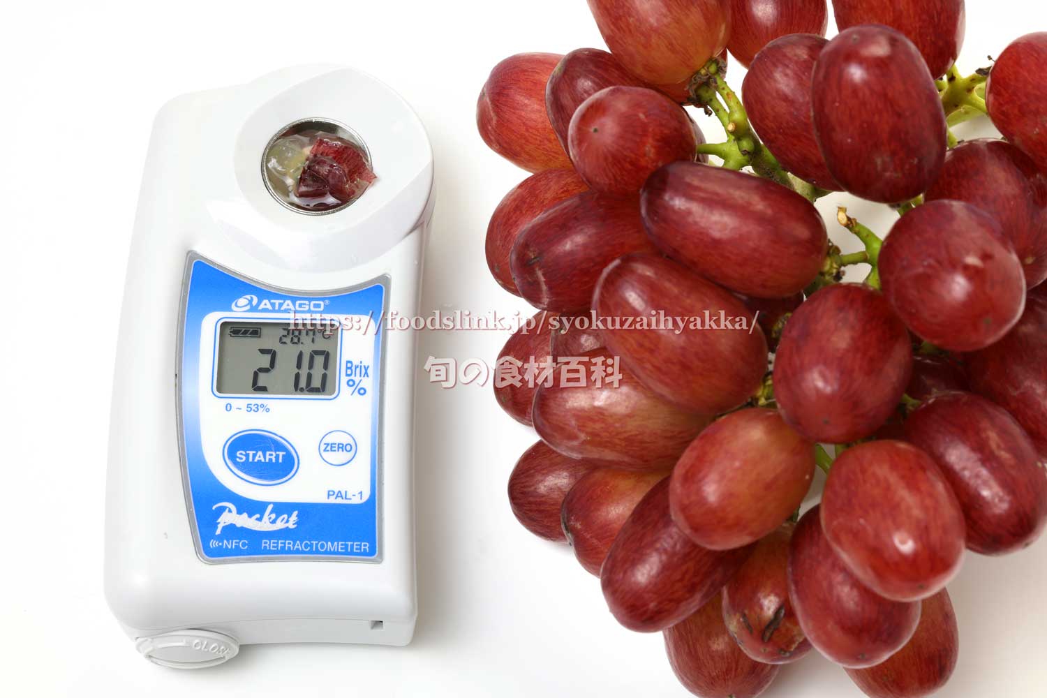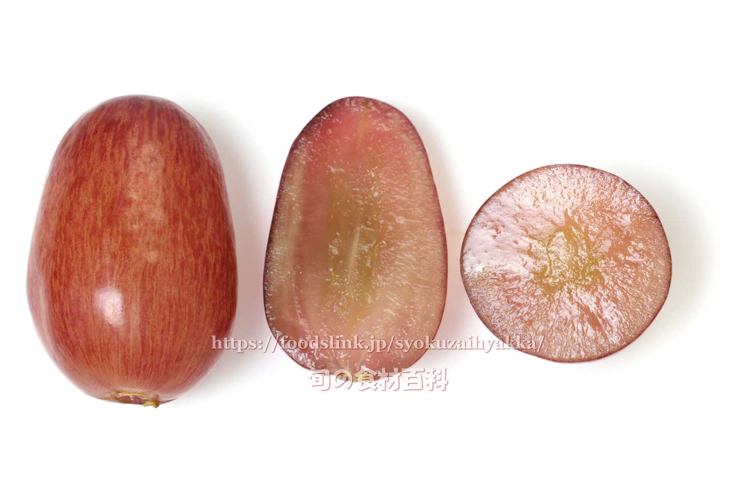 果肉は透明感のある乳白色で、肉質は崩壊性で、糖度は20~25度と高く、酸味はわずかでとても甘いぶどうです。