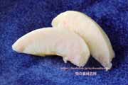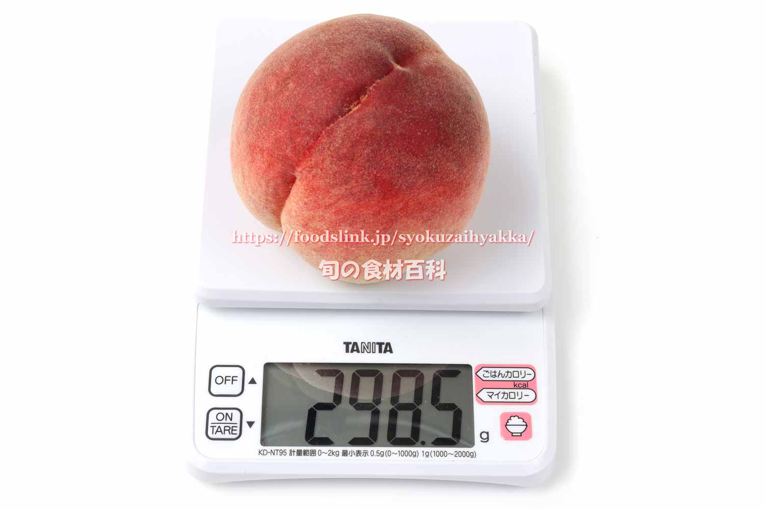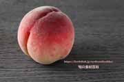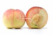 「八幡白鳳」は果重230~300gで果形は扁円形、縫合線は比較的浅く果皮は乳白色の地色に全体に赤く着色します。果肉は乳白色で着色しにくいですが、個体によってほんのりと薄く色が付く者も見られます。種の周りは赤くなりません。