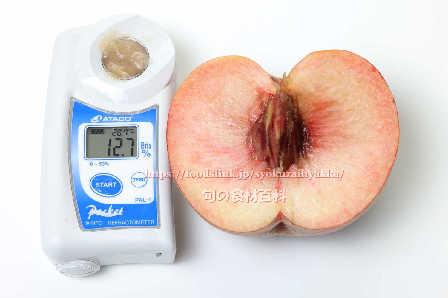 食べてみると、食感は比較的しっかりとしていますがゴム質ではありません。果汁も多く酸味があまりないため、甘さが全面に感じられますが、見た目の印象程甘い訳ではなく、計った糖度は12.7度でした。とはいえ、桃のこの糖度は十分に甘い訳で、食感食味ともとても美味しい桃でした。ただ、香りの点ではあまり強くはありませんでした。