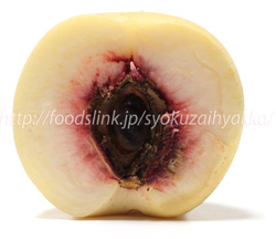 果肉の感じから、白桃系ではあると思いますが、どういった品種を使っているのかなどは栽培時期や生産者さんによって異なるとのことです。上と下の写真は5月中旬に仕入れた山梨県JAふえふき八代の「白美人」等級”一桃匠(特秀)”です。