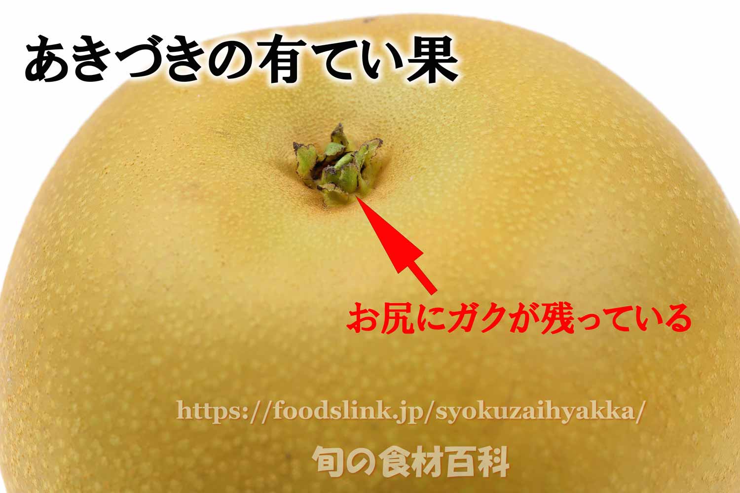 「あきづき」は有てい果の発生が多い品種です、有てい果とは下の写真のようにお尻(果頂部)に花の名残であるガク片が残っている果実の事で、「あきづき」に関しては無てい果と品質的には変わらないです。