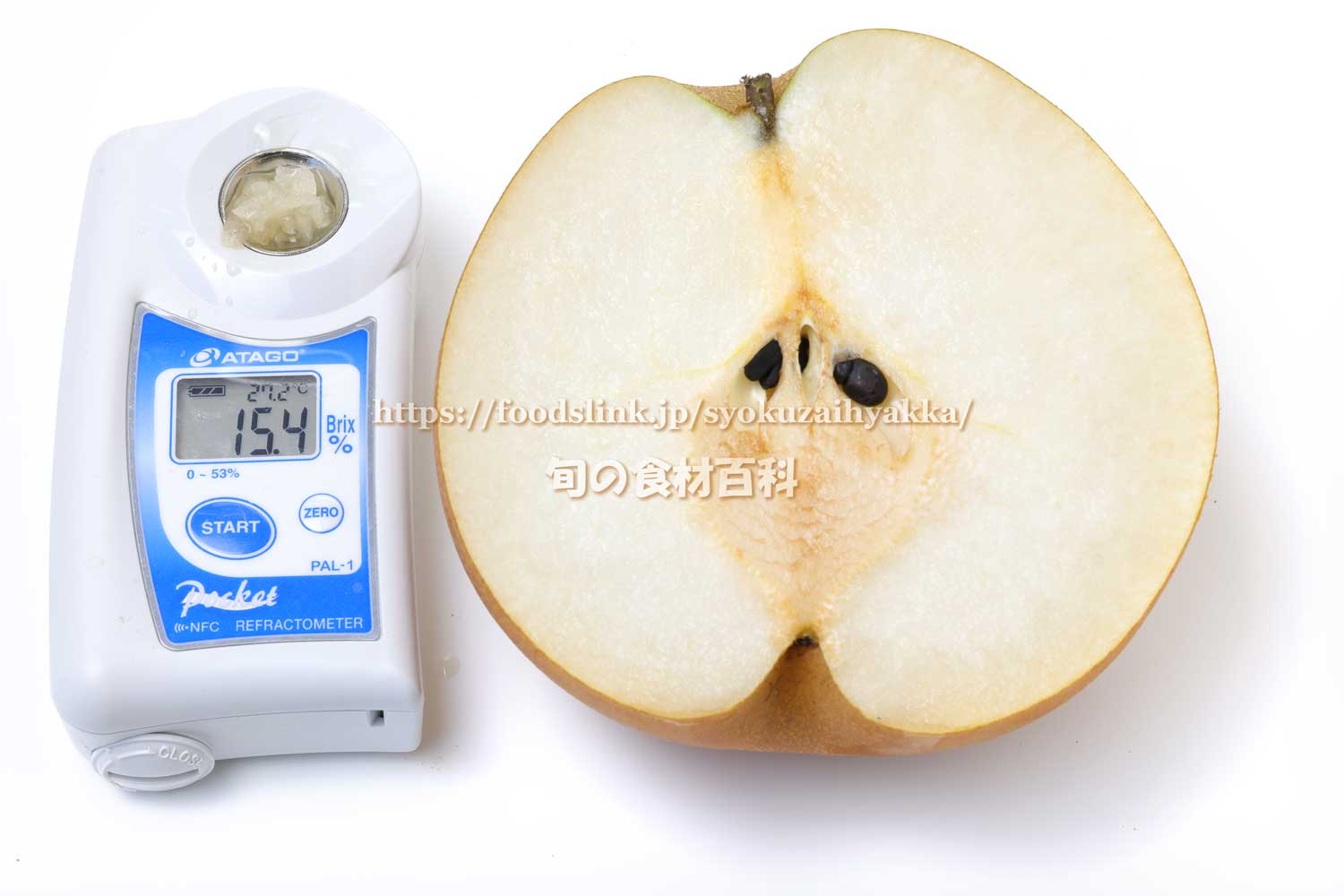 果肉はやや雪白で、肉質は「豊水」なみに柔らかく、糖度12.1%、酸味(pH)は5.08で酸味が少なく甘い梨となっています。また、この品種は大きいものの方が糖度が高くなる傾向にあると言われています。