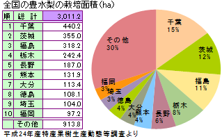 豊水は幸水に次いで多く生産されている梨です。全国でも、沖縄と北海道を除くすべての都府県で栽培されています。表は政府がまとめた平成24年産の全国の豊水の栽培面積です。