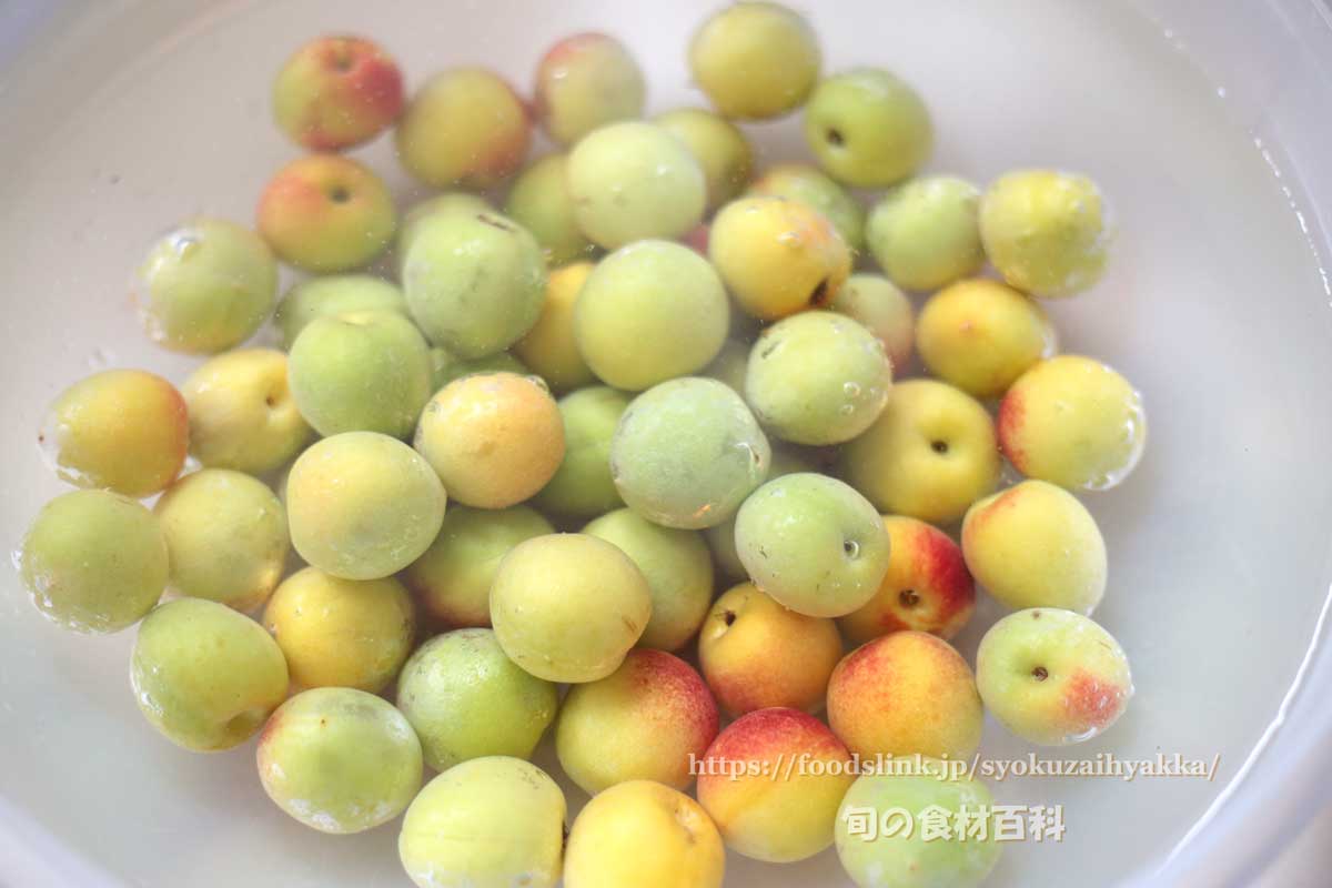 青梅にはアクがあるため、水を張った中に1時間程度浸けてアク抜きします。