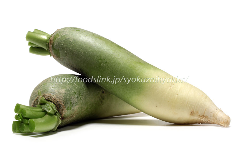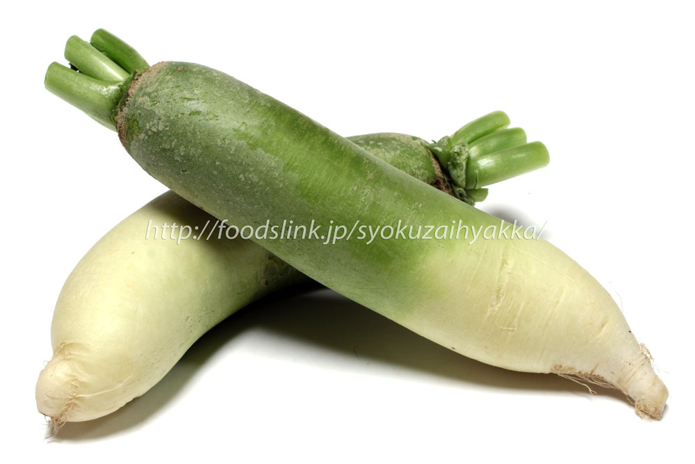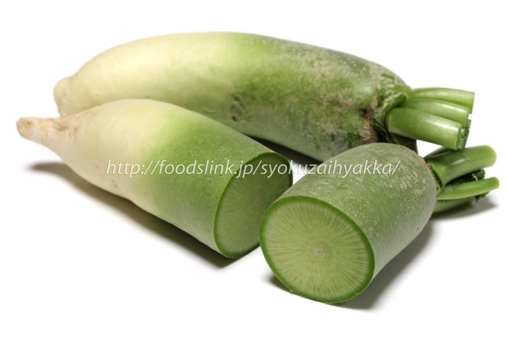 青長ダイコンまたはビタミン大根などと呼ばれる青い大根の様々な写真を紹介します。一般的な大根に比べ小ぶりで、先の方は白く、うえ3分の2以上が緑色で、中の果肉も同じような色をしています。