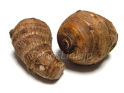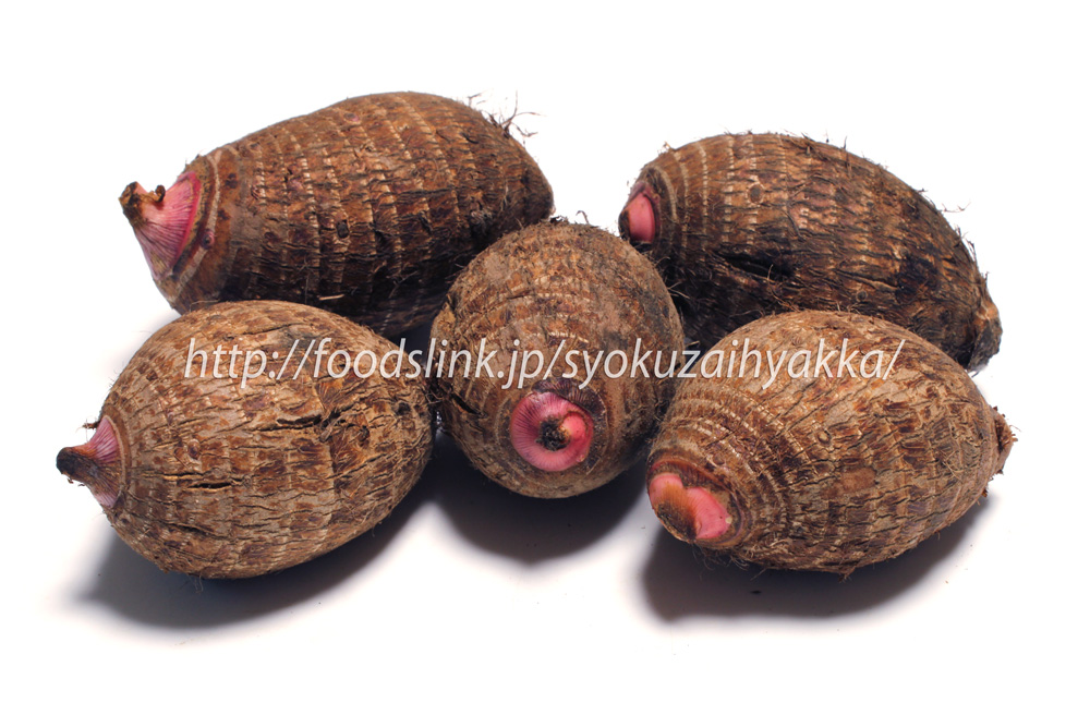 里芋の品種、セレベスの色々な画像を展示しています。セレベスの親芋は大きな球形から長球形で、子芋は球形からふっくらとしたしずく形で、芽の部分が赤いのが特徴です。