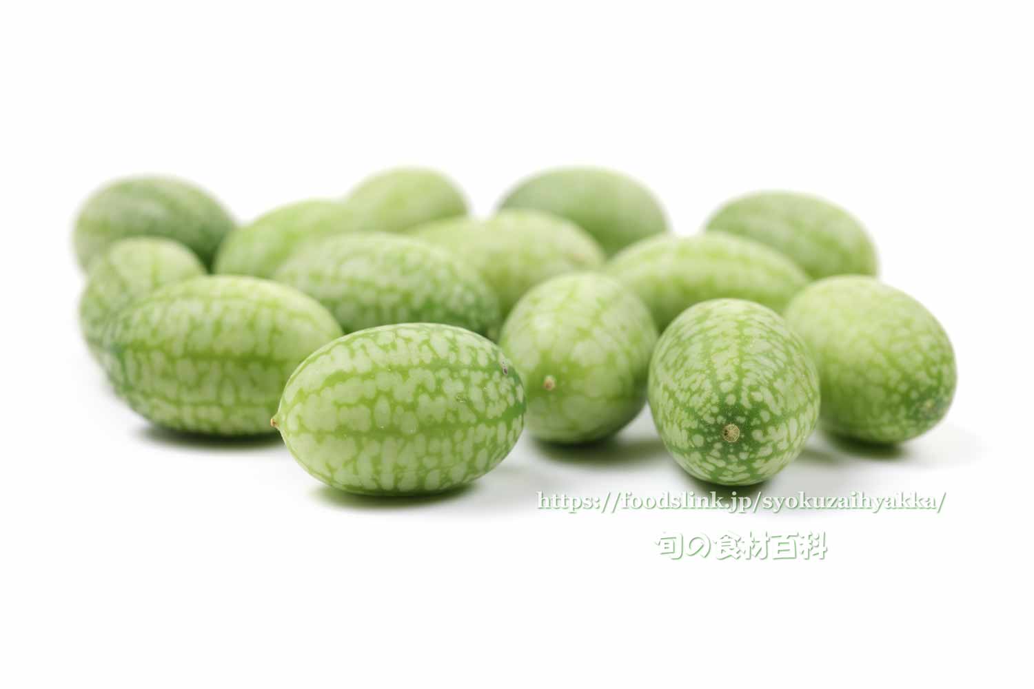 きゅうりメロン/マイクロきゅうりの果実は長さ2cmほどの長楕円形で小さな鳥の卵のような形をしており、果実表面は薄い黄緑色の地にスイカに似た濃緑色の縦縞が入っています。果実の中は透明感のあるゼリー状の中に種が沢山入っています。