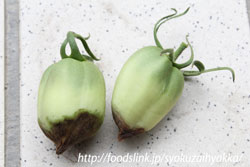 先日のカビは、その後の好天続きで綺麗に消えたのですが、あの時のカビが影響しているのか・・・。本を見ると、尻腐れの原因として考えられる一番は窒素過多かカルシウム不足とのこと・・・。