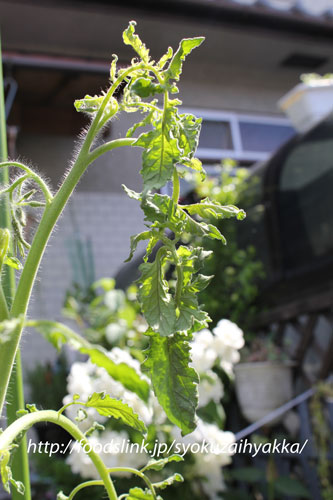 このトマトの苗は葉が細く、茎が少しねじれた感じになっています。どの苗もこんな感じだったのですが、この品種の性質なのか、土の影響かは分かりません。