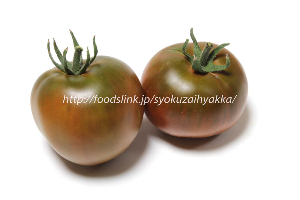 この日に採れた他の品種と並べてみると大きさが分かりやすいかも。大きさは桃太郎など一般的なトマトより少し小ぶりな感じ。手前2個がブラックパールで、左真ん中の同じような色をしているのがパープルロシアン。