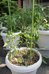 大きくなってきましたが、やはり葉柄はだらんとして状態です。第一花房はまだ開花していません。