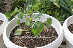 農産物直場所で苗を買ってきて早速鉢に植えました。鉢は結構大きめのものにしています。昨年黒い鉢にしてしまい、夏場温度が上がりすぎた反省から今年は白い鉢にしました。