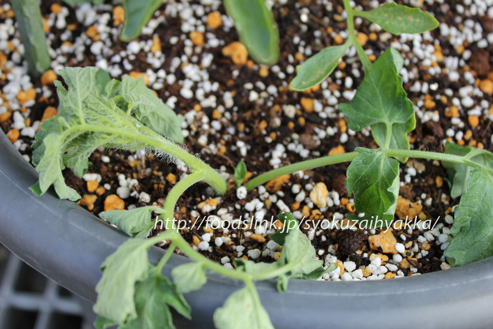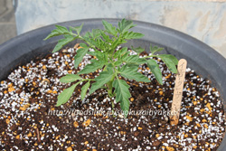 鉢に植えてから約2週間目。葉が順調に茂っています。葉の形状は一般的なトマトと同じ切れ込みが深いタイプです。