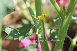 上のほうで2股に枝分かれし始めているが、ミニトマトと言うことで2本仕立てにするか迷うところ・・・。ひとまず放置。