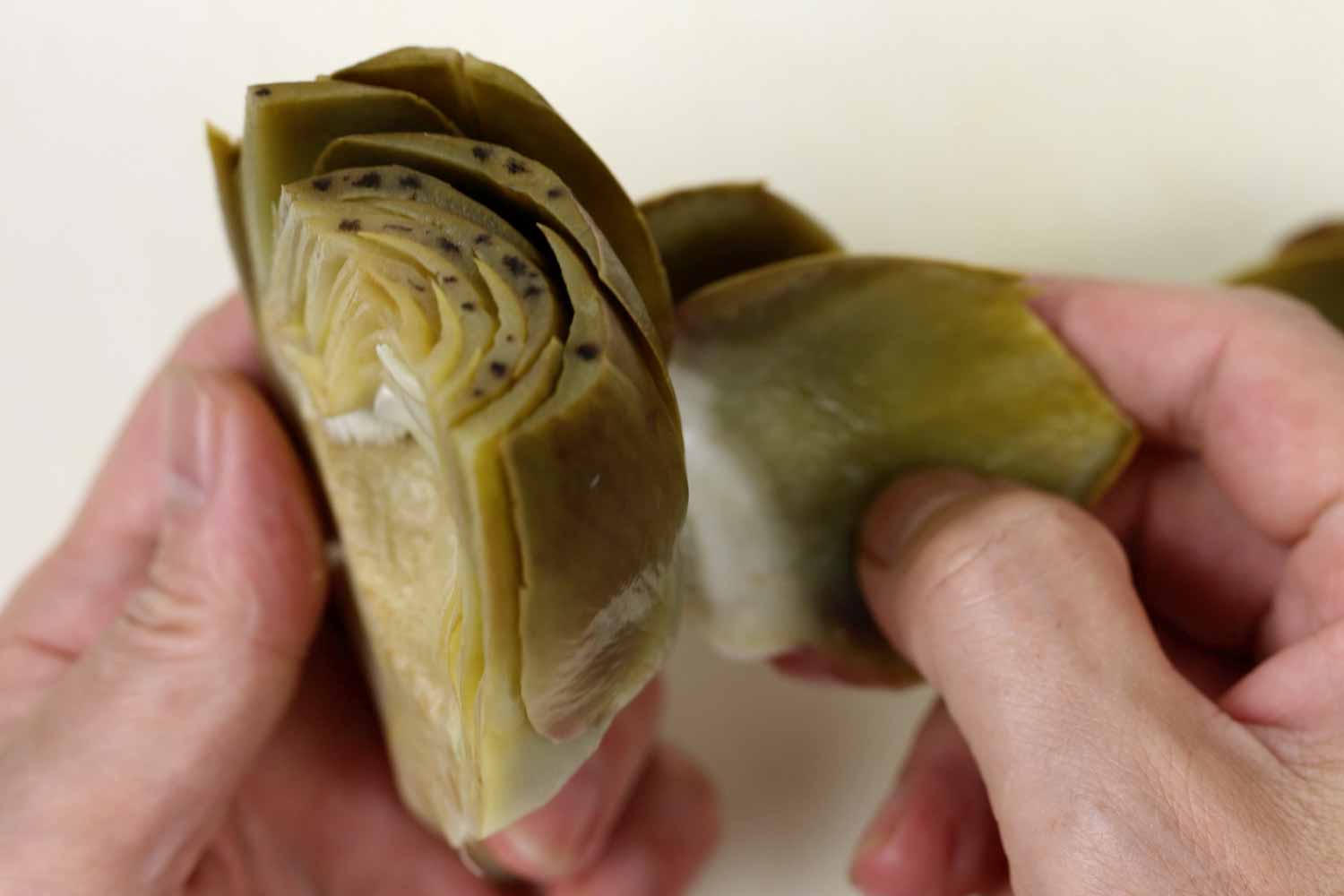 茹でたアーティチョークは柔らかくなり、ガク(苞片)は抵抗なく簡単にはがせます。