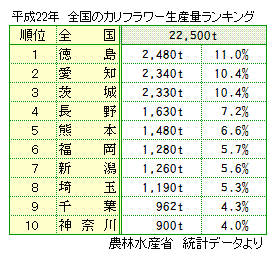 カリフラワーの主な産地は徳島県、愛知県、茨城県などです。