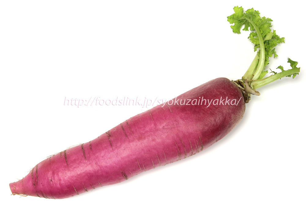 レディーサラダは一本が200~350g程の大きさで、大根の中では小さく、外皮が赤紫色で中は白いのが特徴です。大きさや形、色や質感が分かりやすいよういろいろな角度から撮影した写真です。。