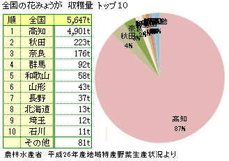 花ミョウガは高知県のハウス栽培で通年出荷されており、その生産量も圧倒的に日本一。政府がまとめた2014(平成26)年産の全国の生産量で見ると高知県が4901トンで全国の80%以上を占めており、そのほとんどは施設栽培で生産されています。一方、続く秋田県や奈良県、群馬県などでは主に露地栽培で生産されています。
