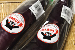 栽培の手間や、果実が柔らかく、流通面でも注意が必要なことなどから、一本あたりの価格は決して安くはありませんが、大きいので一本でも食べ応えはあります。熊本県内などでは「ヒゴムラサキ」としても一般的に見かけますが、他府県の百貨店などではブランド化を進めているくまもんのマークが入ったシールが張られているものが並んでいます。