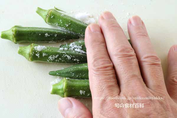 ◆2分茹でて・・・2%の塩加減(水1Lに塩20g)で2分間茹でてから生の物と同じように使う事も出来ます。オクラの場合はブロッコリーなどと同じように、沸騰してから入れます。およそ2分くらいで茹であがります。時間は好みで調節してください。